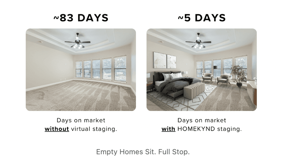 Our virtual staging focus was simple: invite users to imagine themselves in the home so that they could build an emotional connection to the space. After our premium virtual staging services by pro interior designers, 90 properties went under contract in 60 days. To take it a step further, we knew we connected the emotional dots because the buyer’s agents from those same properties came back to us because their clients wanted to know where the furniture pieces were from! And ultimately this is where the HOMEKYND product was born.